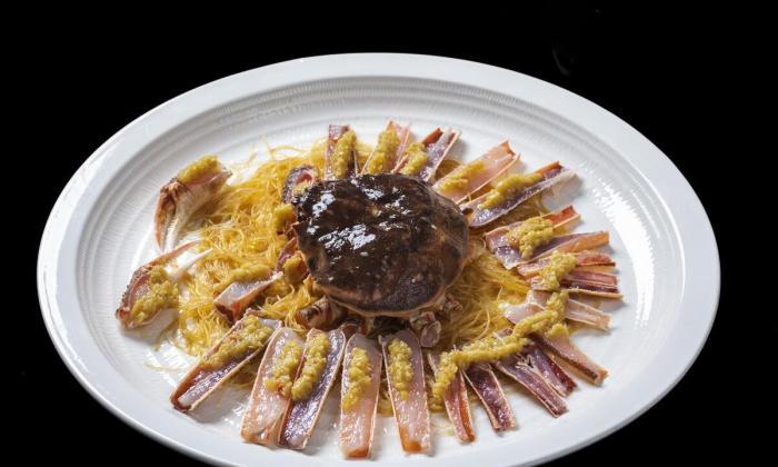 ④ 起鍋前加炸金蒜5g,裝盤時用蟹殼作容器更吸睛